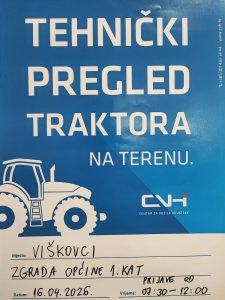 Tehnički pregled traktora obavit će se 16.04.2026. od 07:30 – 12:00, u Viškovcima, Grobljanska 26, u maloj sali.